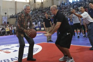 nusakini.com-Semarang – Gubernur Jawa Tengah Ganjar Pranowo berhasil memasukkan bola ke ring basket saat mengikuti Coaching Clinic Junior National Basketball Association (NBA) Academy di GOR Sumber Waras Semarang, Rabu (...
