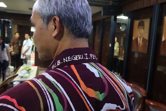 “Dulu yang batik ciprat juga saya jahit dan saya pakai sehari-hari. Sekarang ini saya dapat terus ada tulisannya ini, sengaja tidak saya hilangkan dan saya minta penjahit saya untuk buat. Ini yang buat SLB Negeri 1 Pemalang,” ungkap gubernur.