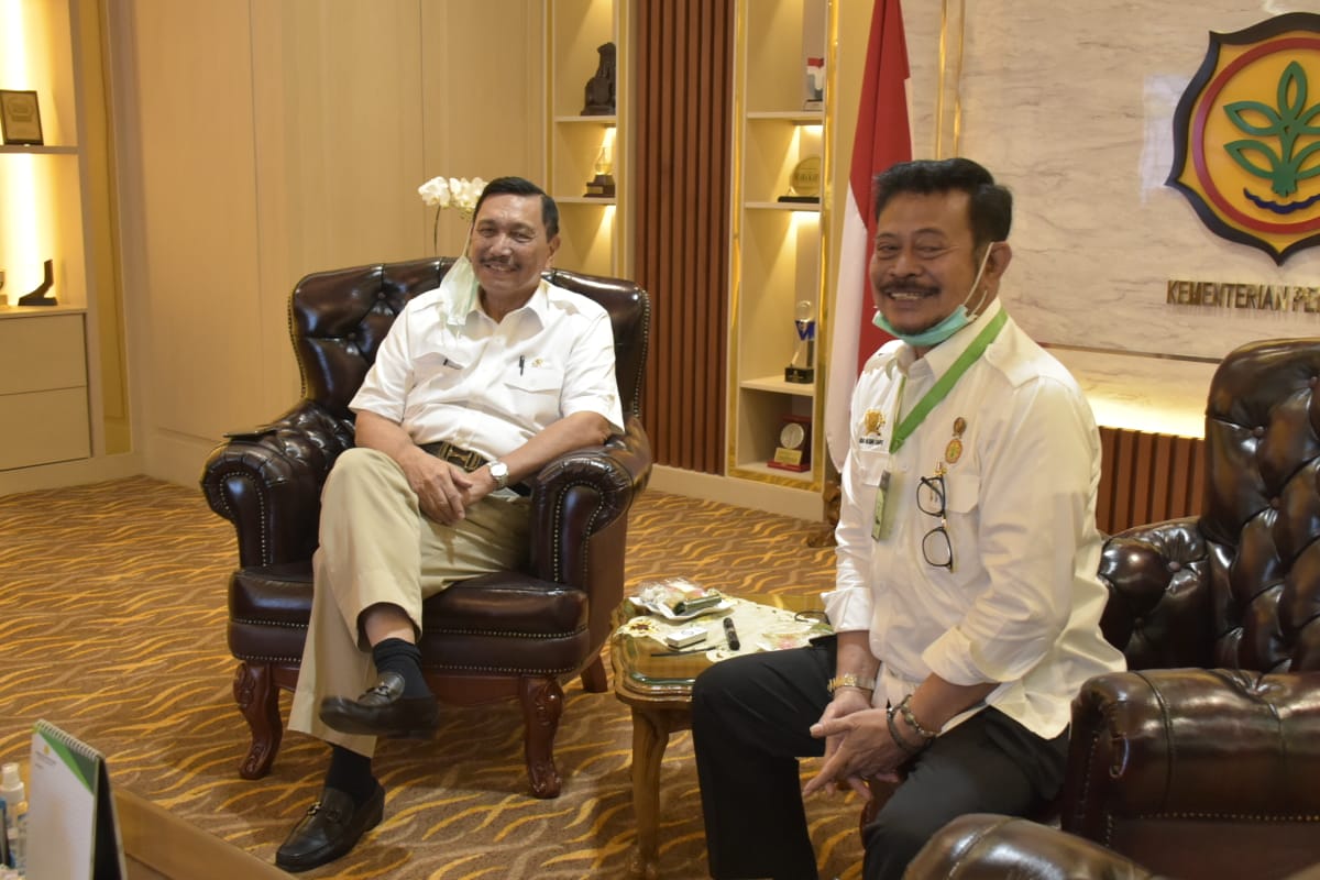 nusakini.com - Jakarta – Menteri Pertanian (Mentan) Syahrul Yasin Limpo bersama Menteri Koordinator Bidang Kemaritiman dan Investasi Luhut Binsar Pandjaitan menggelar pertemuan dalam rangka menindaklanjuti Lumbung Pangan melalui Super Prioritas Program Pertanian (SP3) di lahan khusus berkualifikasi tinggi dengan komoditas tertentu.