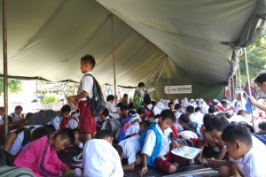nusakini.com-Palu-"Kalau ada gempa, masuk kolong meja. Kalau ada gempa, hindarilah kaca. Kalau ada gempa, lari ke lapangan terbuka". Bait-bait lagu "Kalau Ada Gempa" yang dinyanyikan siswa siswi menyambut relawan Pertam...