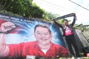 nusakini.com--Menpora Imam Nahrawi didampingi Istrinya Shobibah Rohmah memberikan apresiasi kepada para seniman Kota Ambon yang membuat mural dirinya bersama Ketua Umum PP Fatayat NU Anggia Ermarini di sisi Jalan Raya Ba...