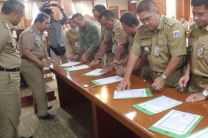 nusakini.com- Jakarta - Aparatur Sipil Negara (ASN) di Pemerintah Kota (Pemkot) Administrasi Jakarta Pusat mulai dari Asisten, Kepala Bagian, hingga Camat menandatangani Perjanjian Kinerja Tahun 2018.Wali Kota Jakarta Pu...