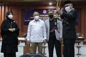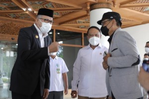 nusakini.com-Banda Aceh-Ditengah-tengah mendampingi raker Komisi X DPR RI, Menpora Amali menyerahkan peralatan olahraga, yang secara simbolis diterima Gubernur Aceh Nova Iriansyah, di Gedung Serbaguna Setda Aceh, Rabu (2...