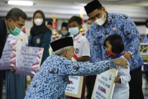 nusakini.com-Semarang- Yamtini (32), tak bisa menahan kesedihannya, saat melihat kedua anaknya, Ahmad Ihya Hakim (12) dan Desta Meliana (6) dielus kepalanya oleh Gubernur Jawa Tengah, Ganjar Pranowo dalam acara HUT ke-50...