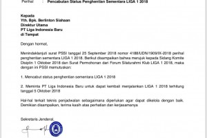 nusakini.com-Jakarta-Liga 1 2018 bisa bergulir mulai 5 Oktober 2018. Hal itu tertuang pada surat resmi PSSI dengan nomor 4302/UDN/1958/X-2018 tertanggal 1 Oktober. Surat itu ditandatangani oleh Ratu Tisha, Sekjen PSSI di...