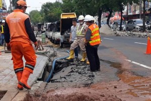 nusakini.com-Jakarta-Pipa saluran air milik salah satu perusahaan air di Jakarta, mengalami kebocoran hingga mengenangi Jalan Lapangan Bola, Kebon Jeruk. Kebocoran pipa air bersih itu diduga akibat beban berat yang melin...