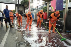 nusakini.com-Jakarta- Pemerintah Kota (Pemkot) Jakarta Pusat (Jakpus) membersihkan trotoar sepanjang 2 km di Jalan Thamrin Jakpus, Jumat (2/11). Pembersihan trotoar dilakukan dengan dicuci dan disikat. Ratusan pet...