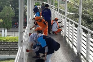 nusakini.com - Petugas Penanganan Prasarana dan Sarana Umum (PPSU) bersama anggota Karang Taruna RW 01, Kelurahan Tanjung Barat, Kecamatan Jagakarsa, Jakarta Selatan, melakukan perbaikan ringan jembatan penyeberangan ora...