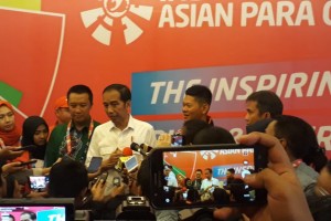 nusakini.com--Jakarta--Presiden Jokowi didampingi Menpora dan Ketua INAPGOC menjawab wartawan usai menyaksikan cabang angkat berat Asian Para Games 2018, di Balai Sudirman, Jakarta, Rabu (10/10) siang.Presiden Joko Widod...