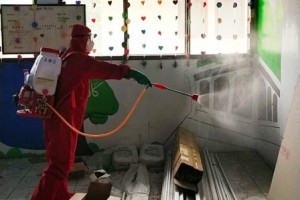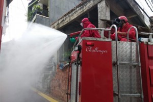 nusakini.com - Jakarta - Suku Dinas Penanggulangan Kebakaran dan Penyelamatan (Sudin Gulkarmat) Jakarta Barat melakukan penyemprotan cairan disinfektan di Jl Tawang Mangu I dan II RW 06, Kedaung Kali Angke, CengkarengKa...
