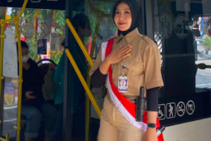 nusakini.com, Ada yang beda pada penampilan petugas pramusapa Transjakarta, Minggu (10/11). Tidak seperti biasanya, hari ini mereka mengenakan pakaian seragam layaknya pejuang kemerdekaan.Kepala Departemen Humas dan CSR...