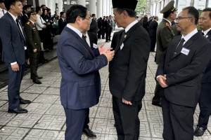HANOI -- Menteri Pertanian RI (Mentan) Andi Amran Sulaiman mewakili Presiden Joko Widodo (Jokowi) terlihat tengah berbincang serius Perdana Menteri Vietnam Pham Minh Chinh di Wisma Duka Negara yang terletak di jantung Ko...