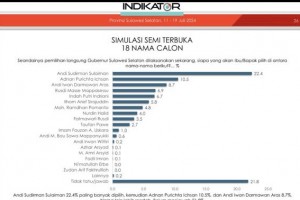 JAKARTA -- Dalam survei terbaru Indikator politik Indonesia terkait elektabilitas kandidat di Pemilihan Gubernur (Pilgub) Sulsel yang dirilis beberapa waktu lalu yang memotret kecenderungan pemilih dalam 18 nama yang dis...