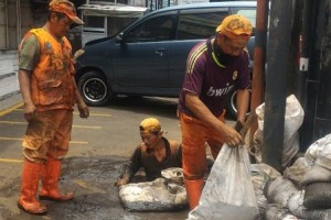 nusakini.com - Jakarta - Lumpur di saluran air Jalan Bintaro Raya, RT 11/10, Kelurahan Kebayoran Lama Selatan, Kebayoran Lama dibersihkan petugas Penanganan Prasarana dan Sarana Umum (PPSU).Lurah Kebayoran Lama Selatan,...