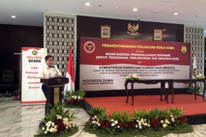 nusakini.com--Menteri Energi dan Sumber Daya Mineral, Ignasius Jonan, Selasa (18/07) beserta Kepala Badan Nasional Penanggulangan Terorisme (BNPT), Suhardi Alius menyaksikan penandatangan perjanjian kerja sama Kementeria...