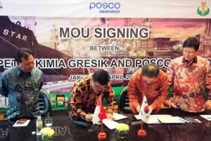 Foto/Petrokimia Gresik nusakini.com - Dalam rangka memperkuat jaringan pemasaran, PT Petrokimia Gresik (PG) yang diwakili oleh Direktur Pemasaran PG, Meinu Sadariyo menandatangani MoU dengan Posco Daewoo Corp di Ja...
