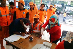 nusakini.com - Sebanyak 151 petugas harian lepas (PHL) Suku Dinas Lingkungan Hidup, Kehutanan, Bina Marga dan Sumber Daya Air Kecamatan Kebon Jeruk, Jakarta Barat, Kamis (16/3), disuntik vaksin anti tetanus.Camat Kebon J...