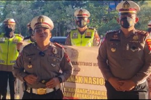 nusakini.com - Makassar - Memperingati Hari Anak Nasional (HAN) Sat. Lantas Polrestabes Makassar dalam pelaksanaan Gatur pagi dengan berlokasi di 20 titik dalam pebagian helm gratis kepada setiap anak yang berboncengan d...