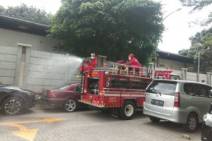nusakini.com - Jakarta - Suku Dinas Penanggulangan Kebakaran dan Penyelamatan (Sudin Gulkarmat) Jakarta Utara dan Kepulauan Seribu melakukan penyemprotan cairan disinfektan di Apartemen Gading Nias Residence, RW 27 Kelur...
